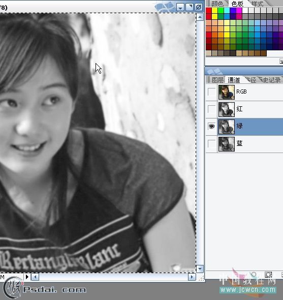 展开通道面板,发现绿色通道.明暗关系很好.比原片要清晰一点.好了决定用它.CTRL+A全选CTRL+C复制.